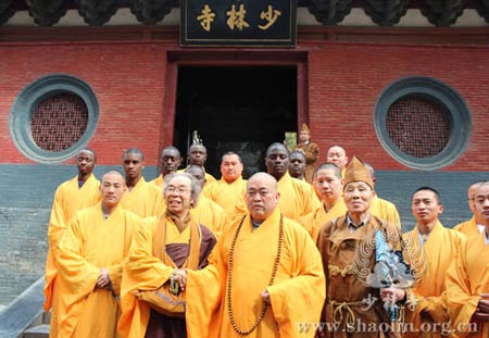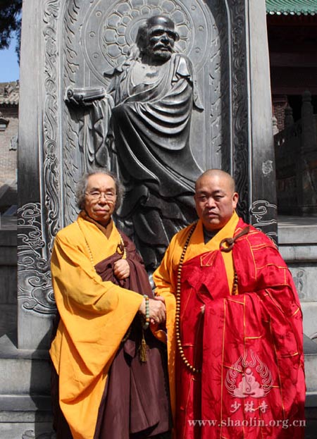 少林寺一直与日本宗教画法学院保持着友好的交往,2010年4月27日,永信法师赴日本出席了在镰仓建长寺举行的达摩始祖石像安放仪式,并与建长寺吉田正道管长、日本禅画家协会平冈嘉卫门共同为石像揭幕。作为少林寺的护法弟子,平冈嘉卫门先生与少林寺结缘十余年,近十年来,每年都会到少林寺归宗朝圣。2007年1月27日上午,平冈嘉卫门先生皈依永信法师,获赐法名“延法”。自此,他更加精勤努力,指导学员们创作了一大批达摩题材的禅画,并相继结集出版。而永信方丈与平冈嘉卫门先生之间的深厚情谊,也将成为中日佛教文化交流史上的一段佳话。