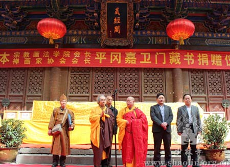 2013年4月9日上午9时30分,河南嵩山少林寺藏经阁前隆重举行日本宗教画法学院院长、日本禅画家协会会长平冈嘉卫门藏书捐赠仪式。少林寺方丈永信法师、平冈嘉卫门先生,登封市委常委、统战部长杨洁,登封市宗教局局长白金永等出席了捐赠仪式。此次,平冈嘉卫门先生共捐献其多年收藏的佛经典籍、禅意书画集等书籍,共52箱,856册。