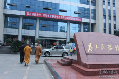 2013年4月22日上午,东林寺慈善护生会一行再次来到四川省民政厅大院。从全国各地开来的装满救灾物资的车辆有序地停在那里卸车,多个慈善机构及志愿者团体在等候、咨询、登记,希望能有所作为。
