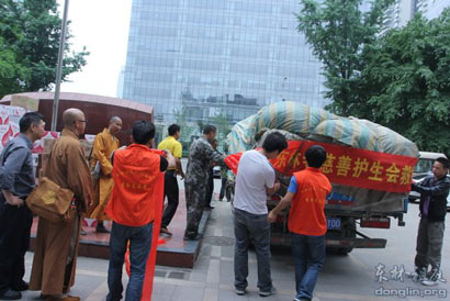 此前一天,由东林慈善护生会组成的临时救援队押送的物资已经在四川省民政厅大院卸载。四川省慈善总会的负责人说,这是他们迄今为止正式接受的第一家来自佛门的爱心捐赠。这让他们感受到了在灾难面前佛门的担当精神和积极作为的一面,很受感动。德日法师和慧量法师代表东林寺慈善护生会表示,虽然当下的情况不便进入现场实施救助,但是我们还是要用放生功德回向、念佛祈福等方式祈愿生者安康,祈愿亡者解脱。同时还转告了庐山东林寺全体僧众于今日下午为四川雅安地震灾区的民众专门举办了一场消灾祈福的法会。同时还表示,在救灾活动进入到平稳秩序阶段时,我们愿意同有关部门一道,为灾区人民进行助念超度、心理安慰等活动,一位在场的人不由脱口而出:“同体大悲,天下一家……”(图片来源:东林慈善功德会)