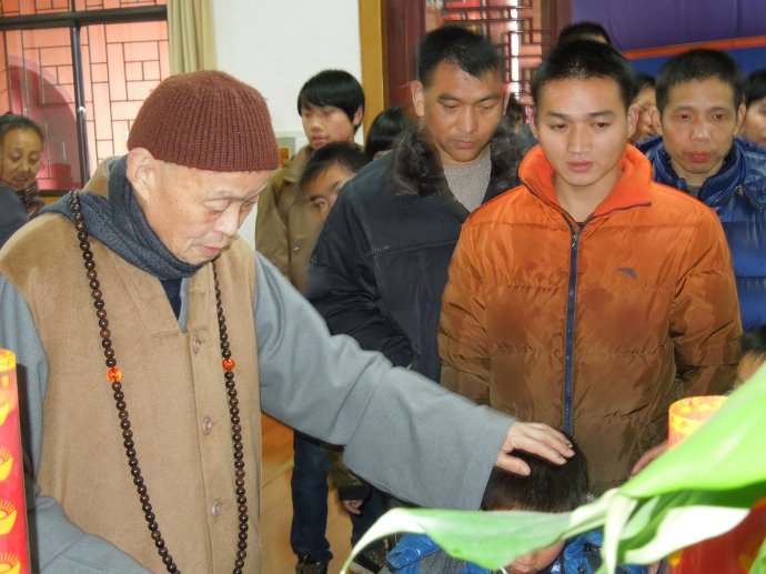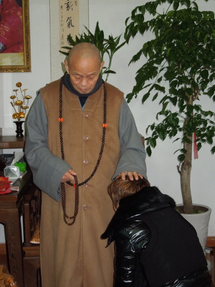 大约半小时后,会议室门开了,趁着一些人进去,我也混了进去。只见老和尚满脸笑容地跟大家打招呼,一些人跪下来请求灌顶。我心里清楚机会难得,也瞅空跪到长老脚下。很快,一只宽大、柔软而温暖的手掌按在我头顶上,我潸然泪下。