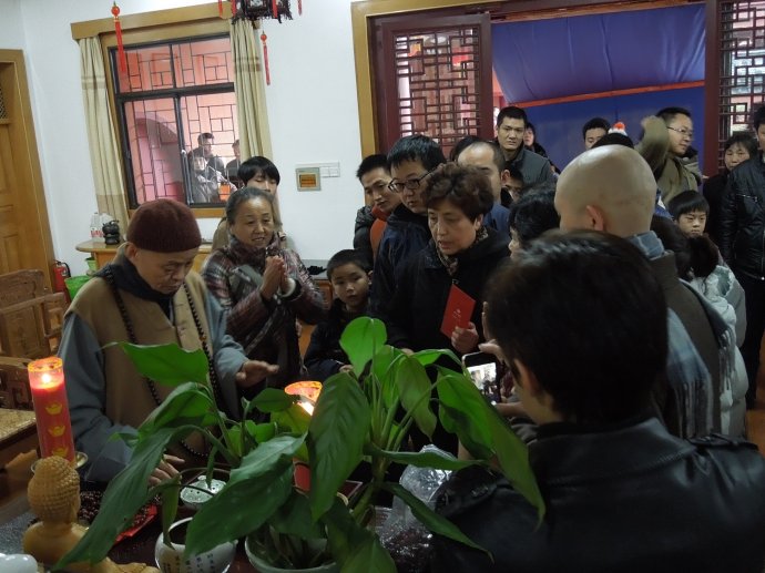 不一会,老和尚走到客厅,这里等待灌顶的人已排到方丈室门外,大约有七八十人。只见老和尚凝神静气,口中不停地念着什么,手掌一次又一次地伸向每一个头顶,无论男女老少,一律平等。一旁的侍者则送给每个人一串佛珠。我发现,现场有一团奇特的祥光笼罩着,每个接受灌顶的人,都满怀欢喜而去。