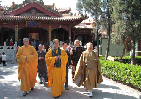 2013年4月9日上午,日本临济宗妙心寺派德源寺住持岭兴岳长老抵达河北省赵州柏林禅寺,柏林禅寺方丈明海法师与监院崇悲法师在山门口热情欢迎岭兴岳长老。