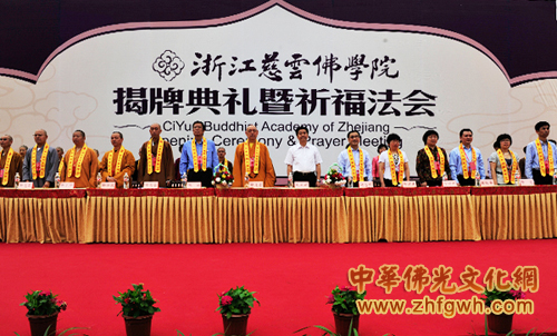 挂牌仪式现场,由宁波佛协副会长、宁海县佛协会会长有圆法师主持典礼。国家宗教局张乐斌副局长,中佛协副会长道慈法师,浙江省委统战部副部长、省民宗委主任冯志礼,宁海县委书记卞吉安等应邀出席并致辞。现场中佛协副会长道慈法师代表传印长老向浙江慈云佛学院赠送书法作品。最后,由浙江省佛协副会长、宁波市佛协会长、浙江慈云佛学院院长诚信法师发言。浙江省佛协会长怡藏法师宣布浙江慈云佛学院领导班子。院长诚信法师礼请名誉院长道慈法师,名誉院长怡藏法师接证书。来自全国各的的诸山长老、领导嘉宾及尼众佛学院师生及信众千余人参加见证了本次盛会。
