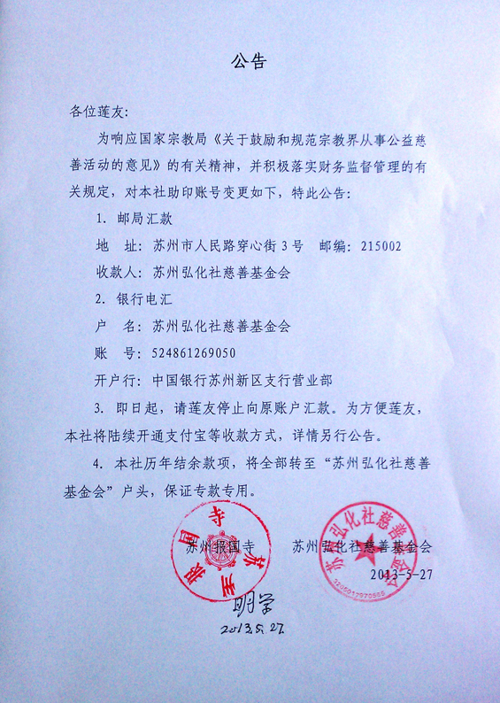 3. 即日起,请莲友停止向原账户汇款。为方便莲友,本社将陆续开通支付宝等收款方式,详情另行公告。