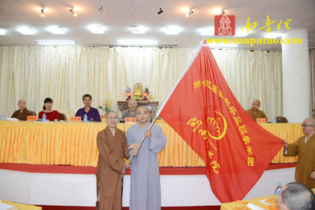 会上,圣辉法师做了重要讲话。他说,两岸同胞同根同源同血脉,两岸亲情友情教情深,所谓“三通未通,宗教先通;宗教未通,佛教先通。”自2002年起,闽院便与台湾教界进行了法务交流活动,这对两岸佛教界的友好往来起到了开启先河的作用。此次出行意义非凡,希望同学们继承和发扬爱国爱教的优良传统,在外参学期间,要有强烈的责任感、使命感和集体观念,做到不攀缘、不浮躁,相互尊重,注重威仪,彼此关心,以维护集体荣誉为荣,充分展示出大陆僧青年的良好精神风貌。之后,院长宣布参学团正式成立,并宣读团成员名单,郑重授予参学团团旗。