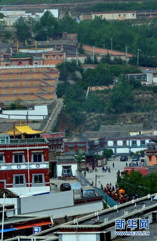 塔尔寺的僧人和信众抬着佛像堆绣走进塔尔寺