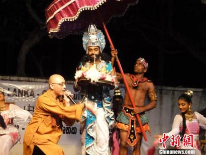 在斯里兰卡圣菩提王寺,一场别开生面的中斯佛教歌舞表演掀起了此次佛教文化交流活动的高潮。其中,最为精彩的一幕是悟演法师同斯里兰卡的孩子们一起,以歌舞演绎当年阿育王派儿子和女儿把佛陀舍利送到斯里兰卡供奉的美丽故事,博得了台下经久不息的掌声。