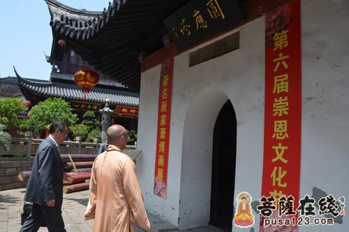 最后,悟端大和尚、费水弟先生、丁锡满先生、程瑜女士、方百川先生、萧博女士、恽甫铭先生、章尚敏先生、陶亚杰先生、刘兆麟先生、袁继先先生、王延林先生、唐菊芳居士、张芸芳女士、杨柏伟先生共同为“观音专题”画展及崇恩文化节开幕剪彩。剪彩仪式后,特邀表演团为西林塔杯第六届崇恩文化节进行了丰富多样的节目表演。赢得了现场阵阵掌声,欢声笑语连绵不断。表演结束后,悟端大和尚和与会人员一同前往圆应塔参观画家萧博女士画展,画展现场不少书画爱好者用相机或摄像机将萧博女士作品拍摄,准备过后再细细品味欣赏。(现场记者:妙静 妙尘 慧悟 慧晨)