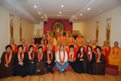 费城大觉禅寺26日举行落成暨佛像开光典礼后,法师与护持居士合影,二排左六为住持明予法师。