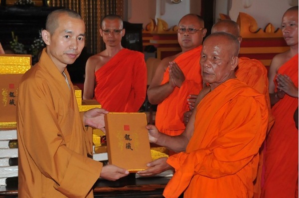 27日上午,在老挝国家佛教委员会隆重举行了《大藏经》捐赠仪式。老挝国家宗教局副局长宋鹏·阿里纳、国家佛教委员会副主席奔玛·辛玛蓬尊者、国家佛学院院长蓬双·乔皮龙尊者出席了捐赠仪式。老挝佛教委员会副主席奔玛·辛玛蓬尊者向常辉法师介绍了老挝佛教的现状,并对中老佛教文化交流予以充分的肯定,并希望加强老挝佛教委员会与河北佛教慈善基金会在慈善领域的更广阔合作。常辉法师随后也介绍了佛教慈善的“无相布施”理念以及本次捐赠《大藏经》的缘起。本次捐赠是老挝佛教界第一次接受并供奉汉传佛教藏经,这也就是在老挝种下了大乘佛教的种子。本次捐赠给老挝佛教界的四套汉传藏经将分别由老挝国家佛教委员会、老挝国家图书馆、老挝国家佛学院、老挝黄鸡香通寺供养。老挝佛教委员会副主席奔玛·辛玛蓬尊者向常辉法师回赠了一尊带有老挝上座部佛教特点的释迦牟尼佛宝像。