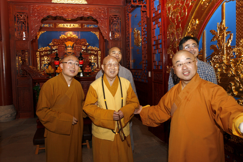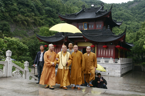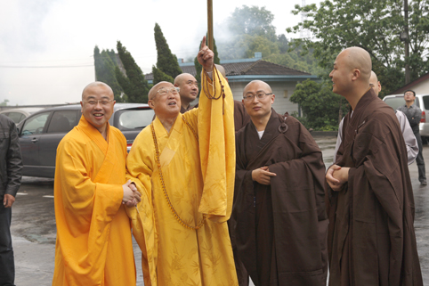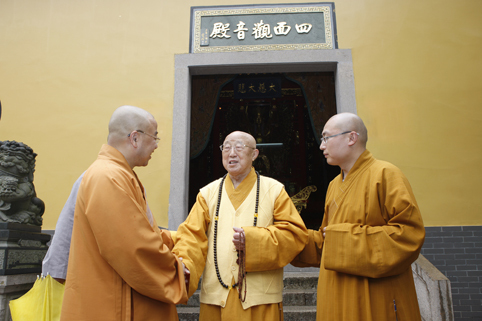 松纯长老红光满面,神采奕奕,在浙江省佛教协会副秘书长、绍兴市佛教协会会长、炉峰禅寺方丈净芳大和尚和江苏省佛教协会副会长、常州市佛教协会副会长、天宁禅寺监院廓尘法师的陪同下,健步下车。此时,阴霾的天气突然明朗,佛光普照大地,四众弟子无不欢欣鼓舞。