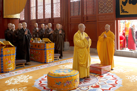 5月8日上午九时许,炉峰禅寺山门外礼炮喧天、鼓乐齐鸣,两序大众排班,至诚恭迎中国佛教协会咨议委员会副主席、江苏省佛教协会名誉会长、常州市佛教协会会长、常州天宁禅寺方丈、绍兴市佛教协会永远名誉会长、炉峰禅寺法主松纯长老法驾光临!