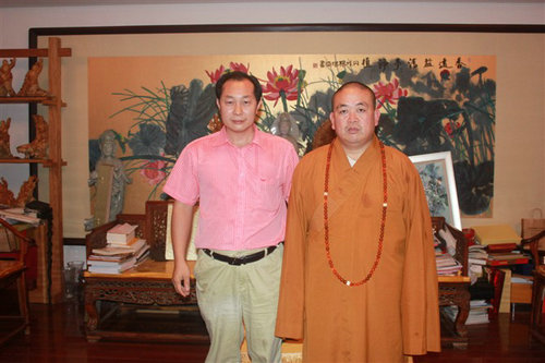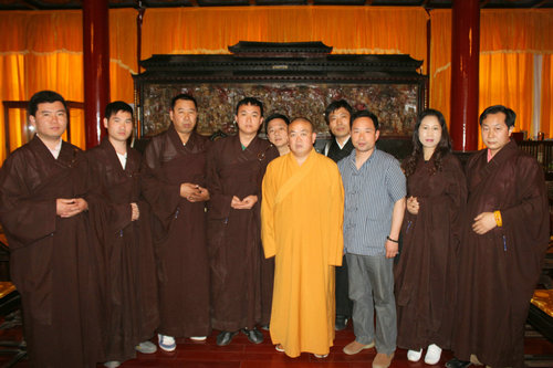 少林寺方丈释永信接受记者采访时合影留念
