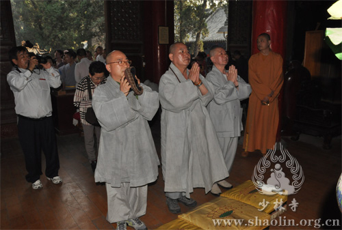 在少林寺监院延琳法师的讲解下,客人们兴致勃勃地参观了少林寺常住院的碑刻、建筑、殿宇等文化古迹。在少林寺大雄宝殿,客人们拈香礼佛,尤为虔诚。