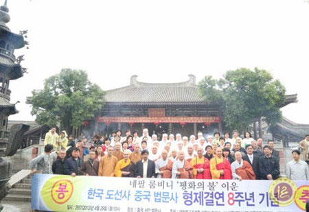 2013年4月29日上午,陕西法门寺隆重举行与韩国道诜寺缔结友好兄弟寺院八周年纪念暨为四川雅安地震灾区祈福超荐法会。全国政协常委、中国佛教协会副会长、法门寺方丈学诚法师率法门寺两序大众热情地接待了韩国道诜寺禅默慧慈长老率领的韩国僧俗信众90余人。学诚法师和韩国道诜寺禅默慧慈长老共同在法门寺大雄宝殿为“中国法门寺与韩国道诜寺缔结友好兄弟寺院八周年纪念暨为四川雅安地震灾区祈福超荐法会”拈香主法。同时,中国佛教协会国际部主任普正法师和省市县各级领导也参加此会盛会。