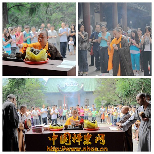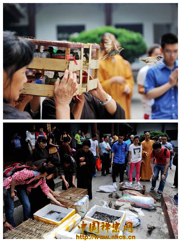 上午9:00时,南华禅寺弘法团众法师带领在家居士于大雄宝殿前举行“端午节”祈福放生法会。众法师秉持利益众生的大乘清净心,为放生生灵诵经持咒、做三皈依,称念佛名,愿其早日离苦得乐,并将放生功德回向尽虚空遍法界一切众生。此次放生的生灵有:观音鸟、鸽子、鳝鱼、乌龟、鲤鱼等。