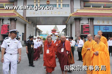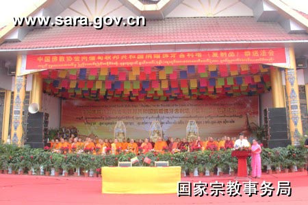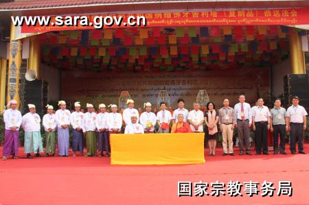 2013年6月7日上午,中国佛教协会在云南省德宏州瑞丽市边境姐告口岸隆重举行赠送缅甸三尊佛牙舍利等身塔恭送法会。中国佛教协会副会长刀述仁、祜巴龙庄勐,副秘书长张琳、常藏法师;国家宗教事务局副局长蒋坚永、外事司司长郭伟、外事司副巡视员赵建政;云南省委常委、统战部部长黄毅,云南省宗教局局长熊胜祥,德宏州和瑞丽市政府主要领导;缅甸宗教部副部长貌貌泰、缅甸驻华大使吴丁乌,缅中友好协会和中缅友好协会等各界嘉宾及佛教界信众数千人出席了法会。