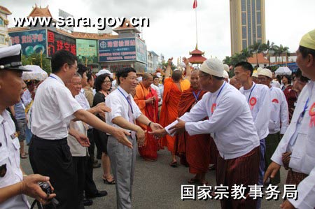 上午10时,姐告广场梵音绕梁,鼓乐喧天。佛牙舍利等身塔恭送法会隆重开始。中国佛教协会副会长祜巴龙庄勐、北京灵光寺方丈常藏法师等高僧共同主法,缅甸高僧与我南传佛教僧人和汉传佛教僧人分别诵念佛经。