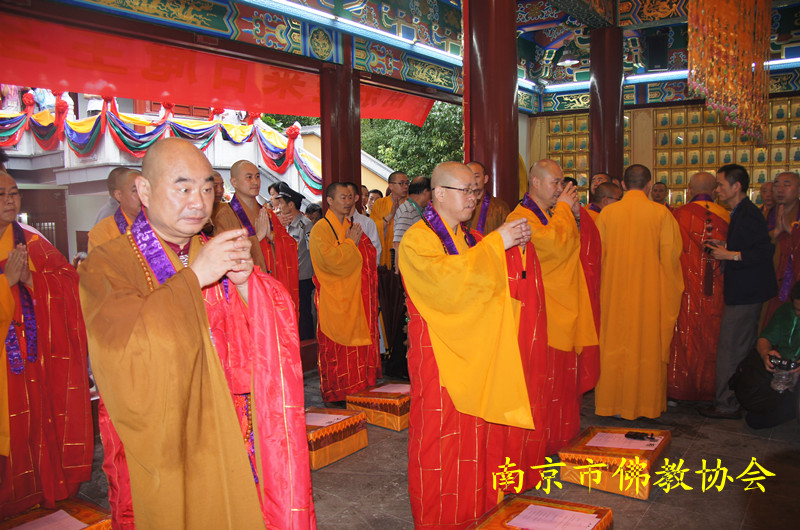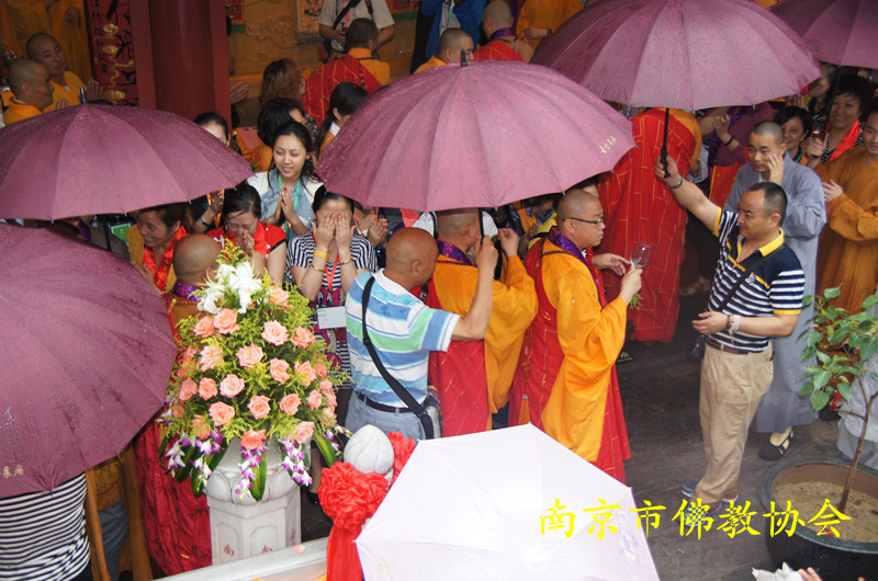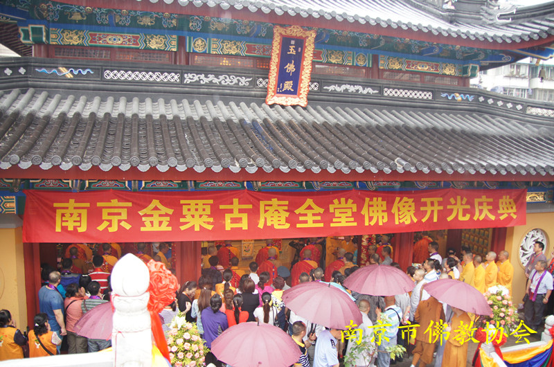 6月7日,南京古金粟庵内佛乐悠扬,经幢高悬,金粟庵玉佛殿落成暨全堂佛像开光庆典隆重举行,虽然天降甘露,但大家热情高涨,中国佛教协会副会长、江西省佛教协会会长、江西佑民寺方丈纯一法师,江苏省佛教协会副会长、扬州大明寺方丈能修法师,江苏省佛教协会副会长、南京市佛教协会会长、南京栖霞寺方丈隆相法师,江苏省佛教协会副会长、南京市佛教协会副会长兼秘书长、南京鸡鸣寺住持 莲华法师,江苏省佛教协会副会长大初法师,江苏省佛教协会副会长、淮安市佛教协会会长曙正法师,江苏省佛教协会副秘书长陈建华先生,福建省佛教协会副会长、漳州市佛教会长、东明寺方丈道裕法师,蒲田南少林寺方丈常定法师,缅甸国仰光十方观音寺方丈明思法师,南京市人大民宗侨外委朱淮宁主任,南京市民宗局宗志清副局长,秦淮区人民政府何伟副区长,秦淮区人大常委会谢德云副主任,秦淮区政协吴建雄副主席,以及有关部门领导、南京市佛教协会各位副会长、全市各寺院法师、居士一千余人参加庆典。