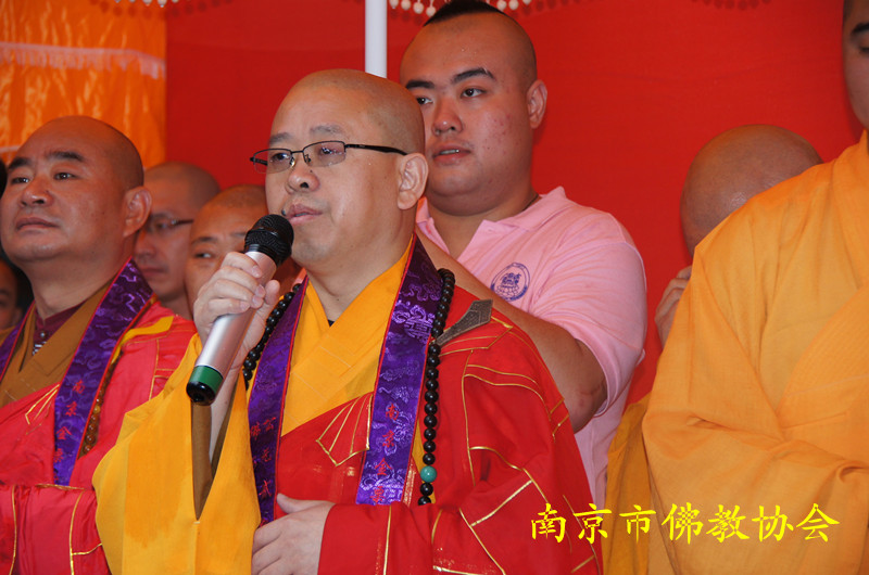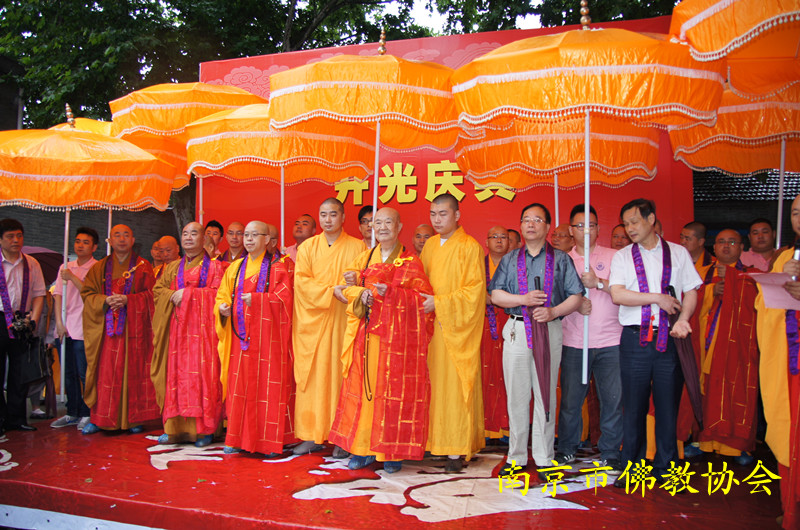 上午9时,庆典开始,南京市佛教协会副会长、南京清凉寺住持理海法师主持庆典。金粟庵住持隆禧法师首先致欢迎辞,江苏省佛教协会副会长、南京市佛教协会会长、南京栖霞寺方丈隆相法师、南京市民宗局宗志清副局长先后致辞,希望金粟庵以此次全堂佛像开光庆典为契机,团结引领信教群众,庄严国土、利乐有情,为构建和谐社会凝聚正能量。中国佛教协会纯一副会长为大家开示!随后纯一法师、能修法师、隆相法师等诸山长老为全堂佛像开光。