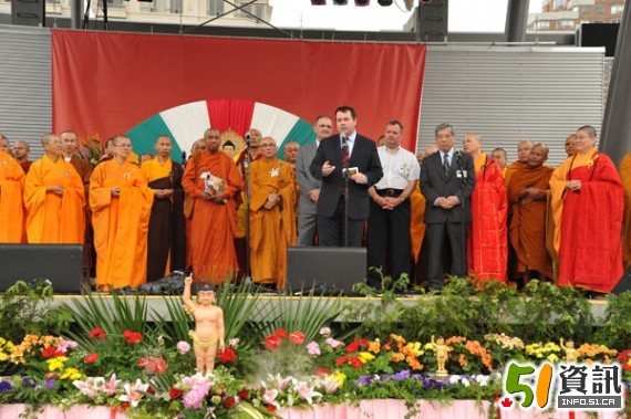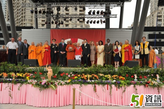 加拿大移民部长康尼(Jason Kenney) 和密西沙加市市长麦考莲 (Hazel McCallion) 分别上台发表谈话,他们赞扬了这项佛教庆典有助促进多元族裔圆融相处,麦考莲同时肯定了多伦多佛光山的社区角色,并且表示欢迎多元宗教团体前来密西沙加市落脚。三个分别属于北传和南传和越南佛教协办单位代表也上场发表谈话,其中的多伦多佛光山住持永固法师以中英文提醒大家力行三好。
