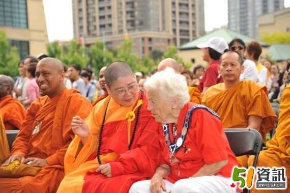 安大略省多元族裔佛教寺院和团体代表六月一日连袂出席在大多伦多西区的密西沙加庆典广场(Mississauga Celebration SQ)联合庆祝佛诞庆典,上百位来自两岸三地、斯里兰卡、越南、印度、孟加拉、缅甸和藏传教佛团体的精神领袖带着与会人士诵经祈福,祈求与会大众自心和悦、家庭和顺、人我和敬、社会和谐、世界和平,祝愿地球更美好。