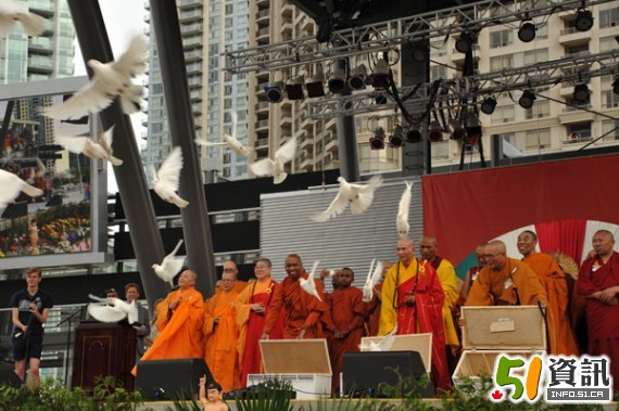 六月一日守着阳光,伴随雨水,湿气笼罩下,各界人士踊跃前来,现场人潮川流,活动由迎宾曲拉开帷幕,由多伦多佛光山龙狮团和斯里兰卡传统舞蹈担任前导,大人、小孩在一旁挥舞加拿大国旗和佛教旗帜,热情欢迎。紧接着由多伦多佛光山合唱团百人大合唱加拿大国歌,随后持施放和平鸽,法师代表并且带领与会人士共同祈福祝祷。