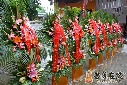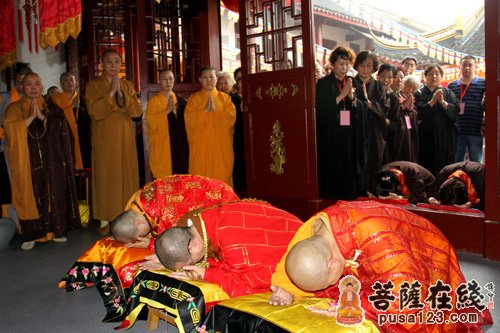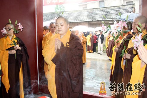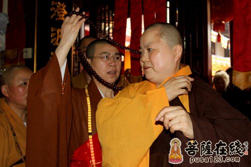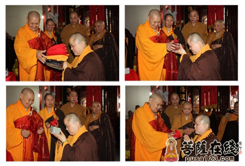 上午9时30分,果圣法师晋院法会正式举行,旃檀庵内彩带飘扬,鲜花簇拥。原成长老为果圣法师授衣、授钵、授珠、授具;定慧法师为果圣法师挂珠。果圣法师说法后,在仪仗队的护送下,缓行至圆通宝殿观世音菩萨像前,拈香、说法语、展礼三拜。原成长老为果圣法师接具送蒲团位,以表承继灵寺法脉。