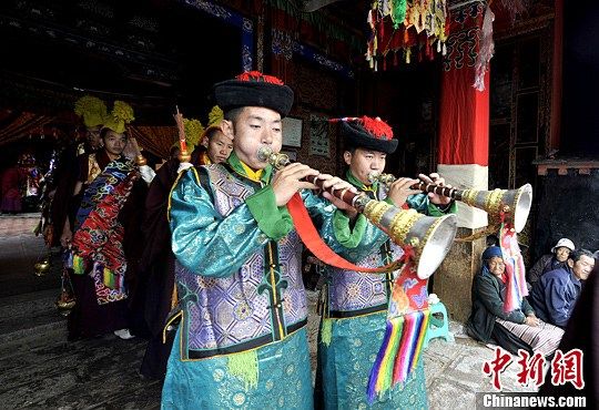 西藏山南地区桑耶寺僧人在神舞表演前吹响唢呐