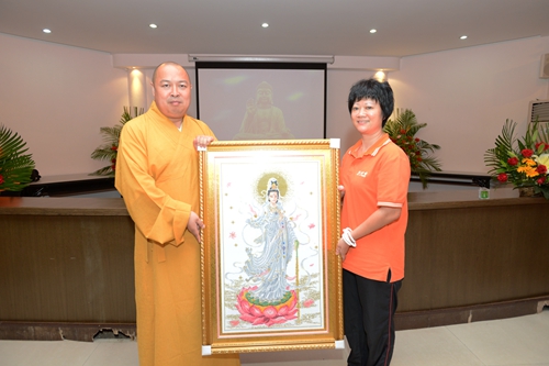 印顺大和尚的一片肺腑之言,深深感染着在场的每一个人,让义工们在欢笑和泪水中深深地思索关于付出、关于奉献的义工精神。精彩的开示一直持续到晚上七点多,才在热烈的掌声中结束。活动最后,学员代表向印顺大和尚赠送了观音画像,印顺大和尚与义工们亲切合影留念!弘法寺义工2013首期初级培训班结业典礼圆满结束。