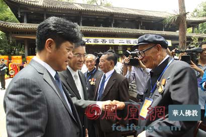 云南省委常委、省委统战部部长黄毅,中国国民党中央评议委员会主席团主席张荣恭与远征军老兵交谈。(图片来源:凤凰网华人佛教 摄影:丹珍旺姆)