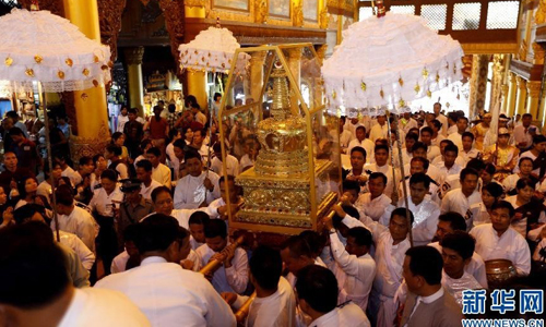 缅甸仰光大金塔盛迎中国赠缅佛牙舍利塔复制品