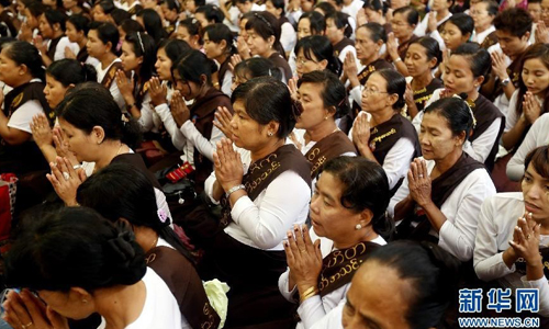 搭载佛牙舍利等身塔的彩车抵达仰光大金塔时,早已在此等候的成千上万信众双手合十瞻礼。按照缅甸佛教习俗,身着白衣的信众抬着佛牙舍利等身塔,在一片诵经声中绕大金塔一周。