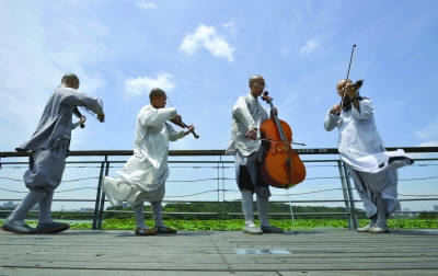 悟乐喜欢音乐,早在上世纪60年代就一个人偷学小提琴。40岁出家后,他产生了组建禅乐队弘法的想法。他介绍,最早的时候,他都是抓着小沙弥手把手教授,“有一点强行灌输的味道”。乐团成立后,他决心要办成高质量、专业化的艺术团体,从武汉请来湖北歌舞剧院的退休教师周俊新老师,教授小提琴、大提琴、钢琴,练习形体、舞蹈和声乐合唱。