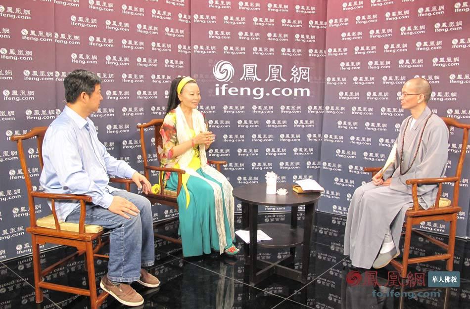 宗舜法师:观众朋友大家好,欢迎收看本期节目。我是凤凰网华人佛教频道的老朋友宗舜,今天呢我们非常有幸的请到了佛乐制作人敬善媛居士,还有我们凤凰网华人佛教频道的编导王琬老师。欢迎你们。大家都比较喜欢听佛教音乐乐。因为这个佛乐称为梵呗,梵在佛教里面是清静的意思,是一种发自内心的清静的声音,在佛经里面都有描写“梵音海潮音,胜彼世间音”,就是说它是胜过一切世俗声音的。我们看到《不肯去观音》这部电影采用的是敬善媛居士演唱的《大悲咒》,还有《心经》的结尾的那个咒语。这样是什么样的因缘促成你的音乐作为片头和背景音乐?