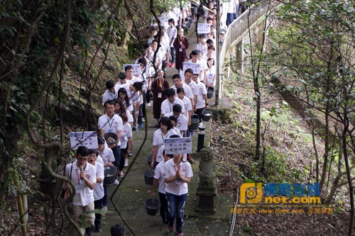 灵鹫山国际青年团120位成员拿铁桶走前山道路体会三十年前开山情形