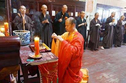 纯闻法师率两序大众在藏经楼进行晒藏经仪式(图片来源:真如禅寺)