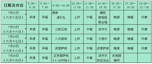 三、求戒资格:具足正信,身心健康,遵守寺规,愿发心奉行菩萨戒法,并已受过三皈的在家男、女二众。