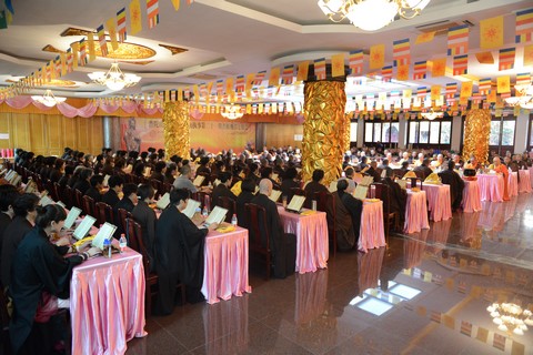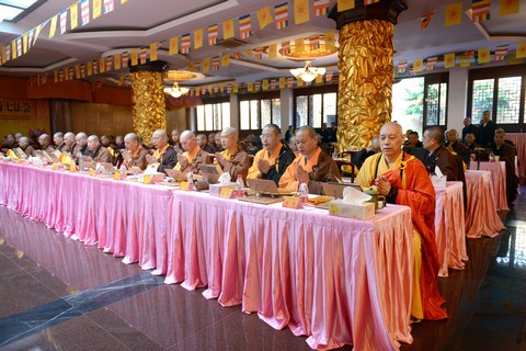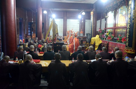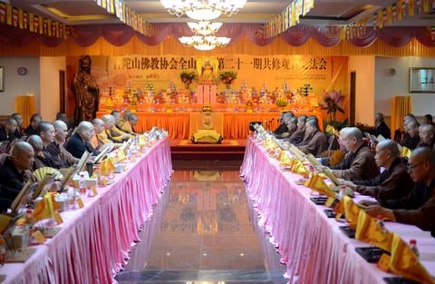 本次共修法会坛场设在普济禅寺。普陀山佛协会长道慈大和尚,副会长惟航法师、净旻法师、信光法师、净妙法师、智宗法师、门肃法师(兼秘书长)等佛协领导,全山各寺院监院等执事,以及部分居士随喜,共约300余人参加了本次法会。全山各寺院除留守值班的执事外,都能准时参加法会共修。