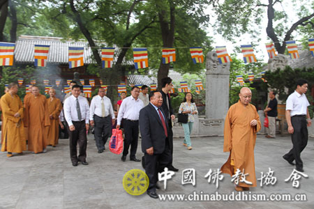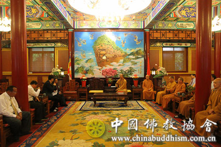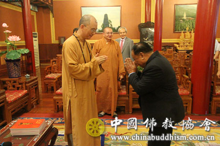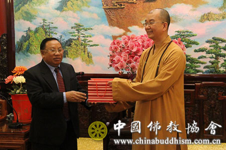2013年7月29日下午,应全国政协邀请,来华访问的老挝建国阵线中央主席潘隆吉先生一行8人拜访中国佛教协会,受到中国佛教协会副会长学诚法师、秘书长王健先生的热情接待。