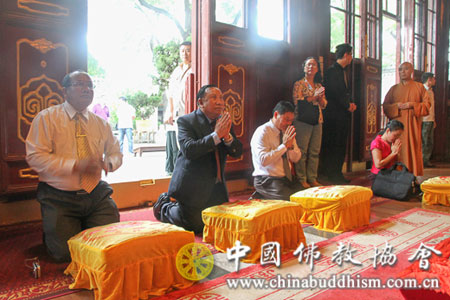 潘隆吉先生一行首先在中国佛教协会副秘书长、北京广济寺方丈演觉法师的陪同下参观了广济寺,并在大雄宝殿内拈香礼佛。随后,学诚法师与潘隆吉先生在怀远堂进行了亲切友好的会谈。