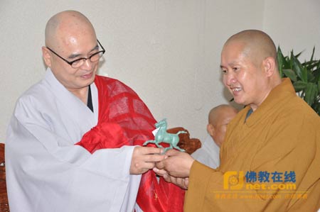 2013年7月4日上午,韩国佛教太高宗参访团一行20多人到甘肃兰州报恩寺参观访问,受到监院洪船法师的热情接待。其间,韩国佛教太高宗参访团代表法师与报恩寺监院洪船法师就佛教宗派,修行方式等做了互相交流。