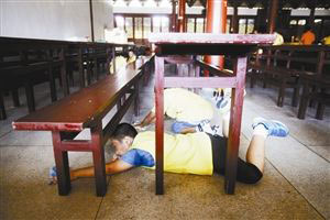 小朋友们在斋堂擦地板(图片来源:晶报)