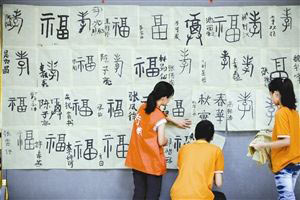 义工老师把国学班小朋友们所写的书法作品贴在墙上展示(图片来源:晶报)