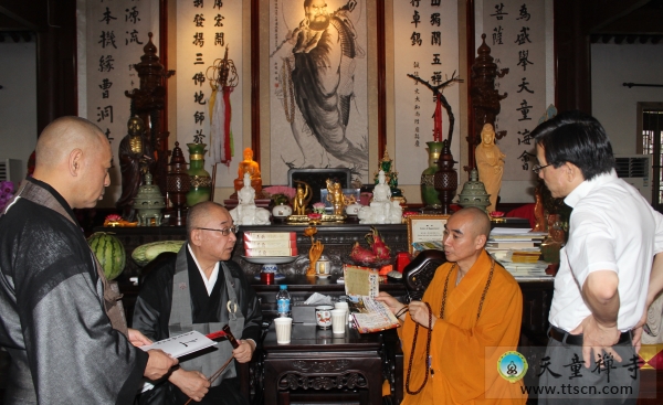 此次大谷哲夫拜访方丈诚信大和尚的主要目的是,邀请方丈和尚在10月份出席国际(中日)禅文化交流协会成立大会并礼请为导师,以及禅文化洞上墨迹研究会创建十周年庆典活动。方丈和尚感谢大谷哲夫在炎炎夏日专程到宁波送来请柬,并表示尽量安排时间出席大会,并就相关事宜进行了商讨。大谷哲夫表示,诚信方丈能出席成立大会,对两国间的友谊以及曹洞宗文化的交流,一定会发挥更大的作用。