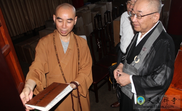 双方在大鉴堂商谈过后,诚信大和尚陪同大谷哲夫会长到藏经楼拜阅明代藏经以及维修中的佛殿。