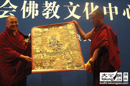 大会上,北京大学宗教研究院名誉院长楼宇烈教授,觉囊派第四十七代法王健阳乐住活佛,中国艺术研究院佛教艺术中心主任田青研究员,中华两岸教育文创发展协会理事长高键智(台湾),著名剧作家、中华文化促进会常务副主席王石等发表了精彩的报告。王石副主席和楼宇烈教授共同为佛教文化中心揭牌。健阳乐住活佛向中心赠送了手绘唐卡一副,北海禅院住持明贤法师向中心赠送工笔重彩玄奘大师圣像绢画一副,中国山水画创作院龙瑞工作室画家李正恩赠送的手书金刚经长卷一部。
