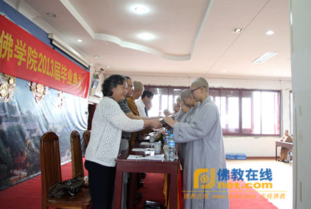 在江苏尼众佛学院教务长慧吉法师主持下,毕业典礼上与会领导、法师、老师分别向佛学院中专班、本科班以及首届觉行在家信众培训班等学生颁发了毕业证书,并为江苏尼众佛学院2013届本科优秀毕业论文获奖者颁发了奖状。