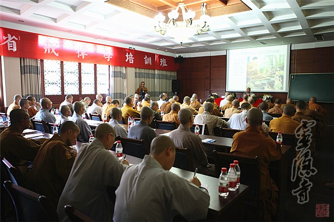 “浙江省戒律学培训班”,由浙江省佛教协会举办,为期三天,开设“戒律学”、“寺院管理”、“丛林规制”等课程。参加本次培训班的60多位学员,全部都是来自于全省(特别是杭州市)各大院的执事法师。通过严格的戒律学学习,为灵隐寺、法镜寺今年秋季传授护国兴圣三坛大戒法会打下基础。